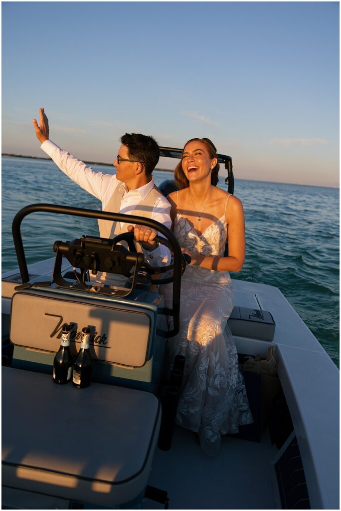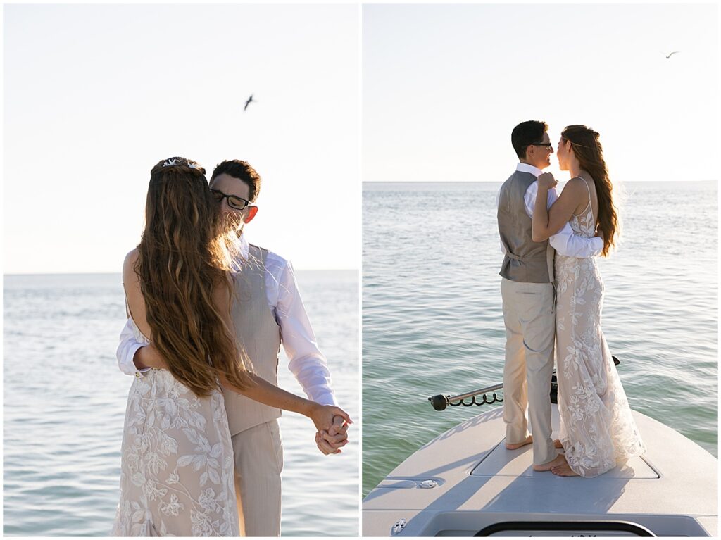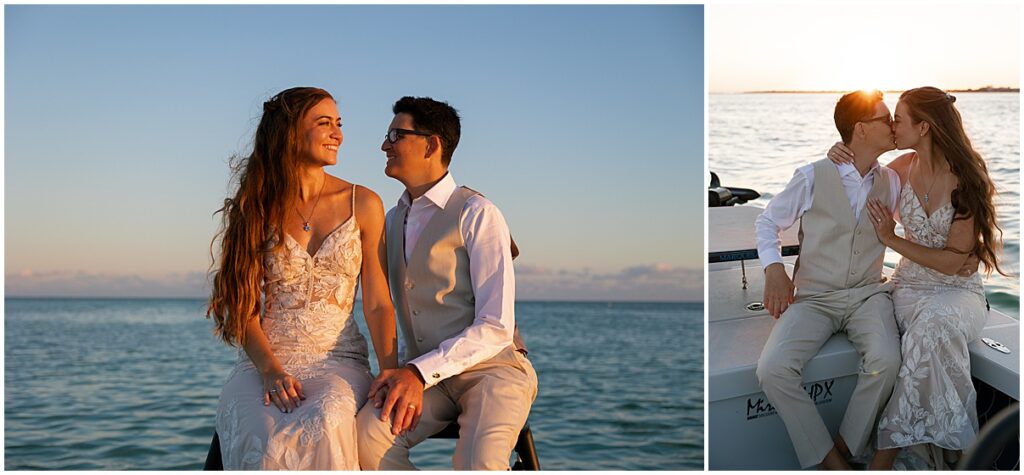 As the celebration came to an end, they saved the best moment for last. They headed out onto the water for sunset photos on their boat. The sky turned golden as the sun dipped lower, reflecting off the ocean around them. It was peaceful, romantic, and full of joy. A true Florida Keys moment.